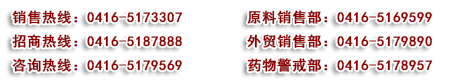 ●招商熱線(xiàn):0416-5187888            ●藥物警戒部:0416-5178957            ●咨詢(xún)熱線(xiàn):0416-5179569