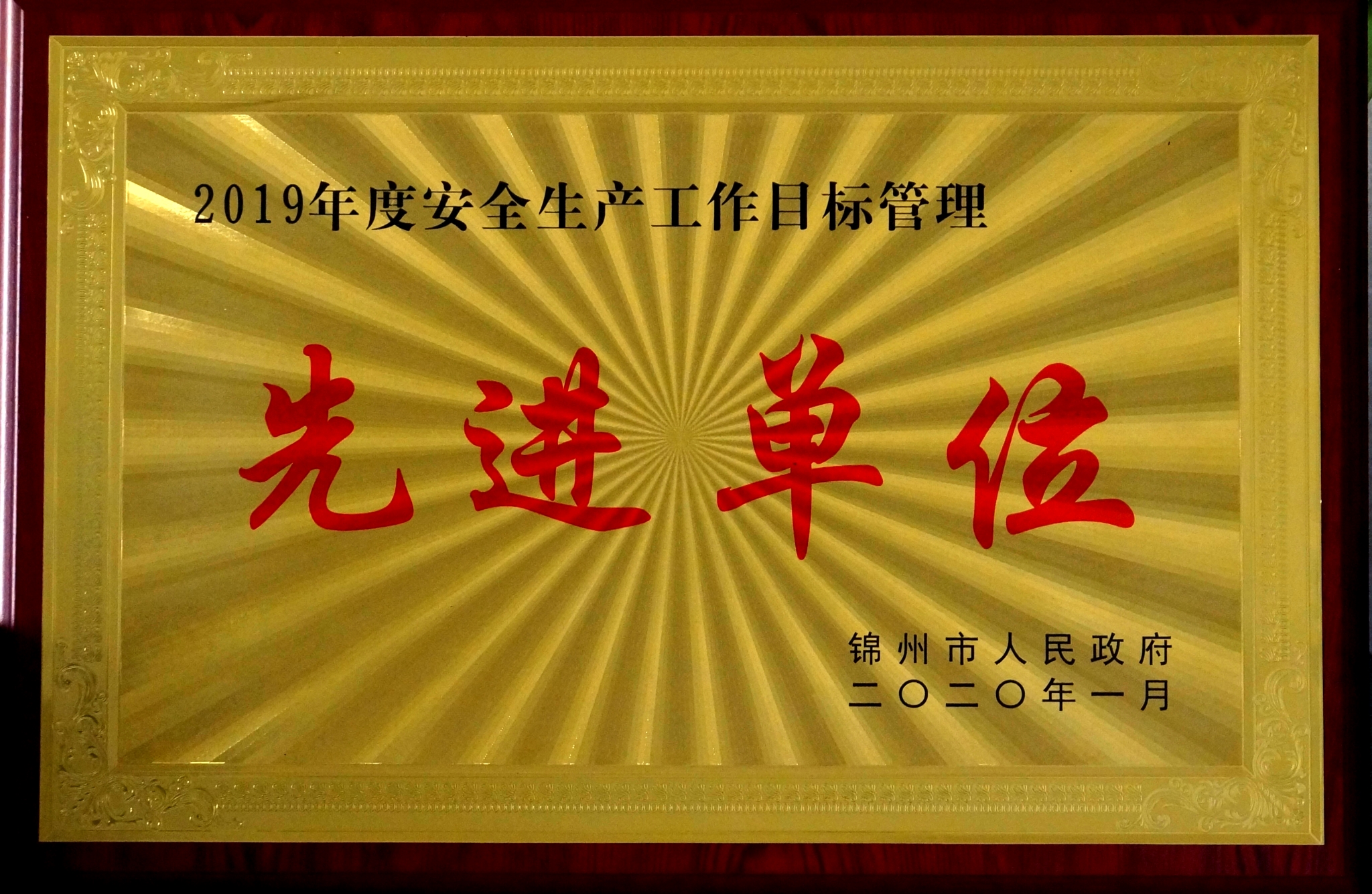 2020年4月,公司被錦州市政府授予“2019年的安全生產(chǎn)工作目標(biāo)管理先進單位”榮譽稱號。